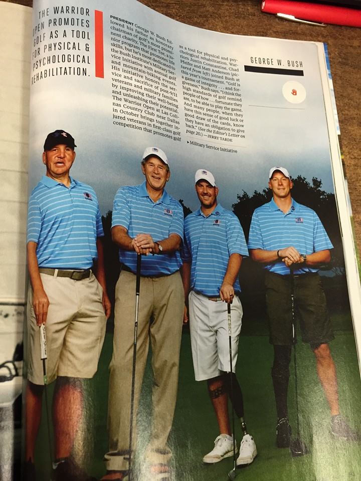 Soon after, he joined President George W. Bush and Laura Bush on the golf course in 2013 and 2014 as a member of Team 43, an adapted sports program run by the Military Service Initiative of the George W. Bush Institute. His involvement in Team 43 was also featured in Golf Digest. He also received custom-made Ping-brand clubs and his name is inscribed on them, given to him early on in his road to recovery. He also participated in several other golf outings, including Tee It Up For The Troops and the AITEC annual outing.